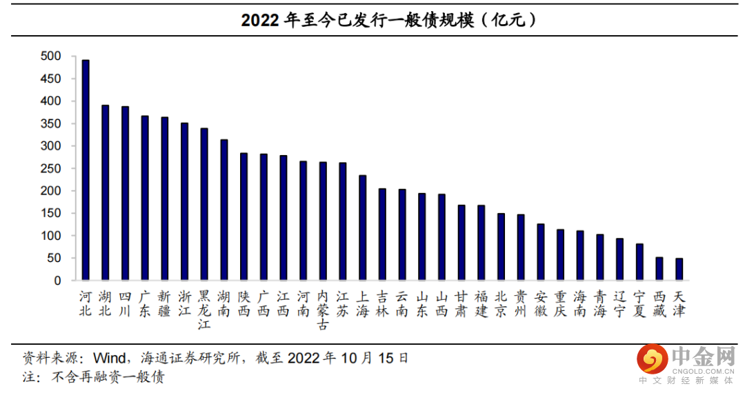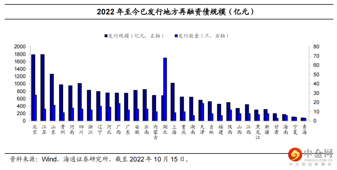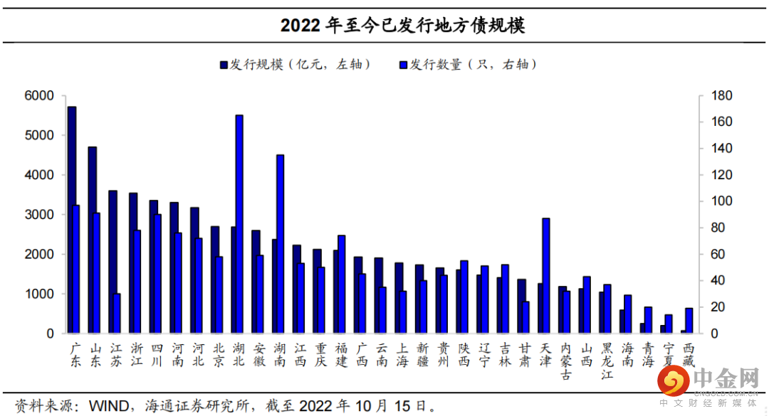 截至10月15日,2022年地方政府债已发行1787只,总规模达6.47万亿元。具体来看,湖北为发行数量最多的地区,共发行165只地方政府债,随后为湖南、广东,分别发行135、97只债券;广东省发行债券规模共计5710.3亿元,发行规模继续位居全国第一。