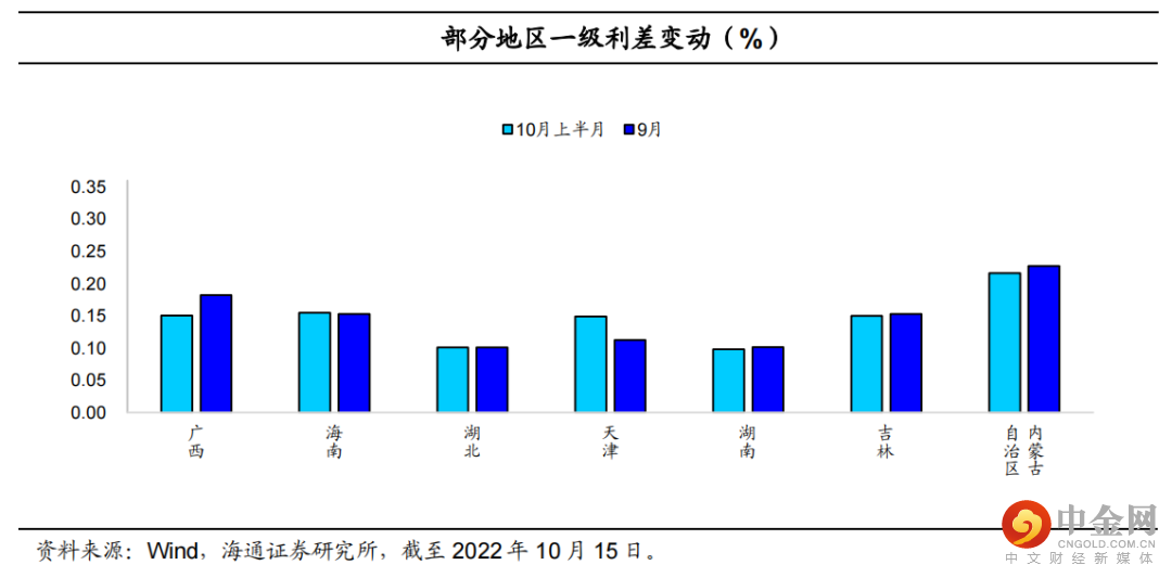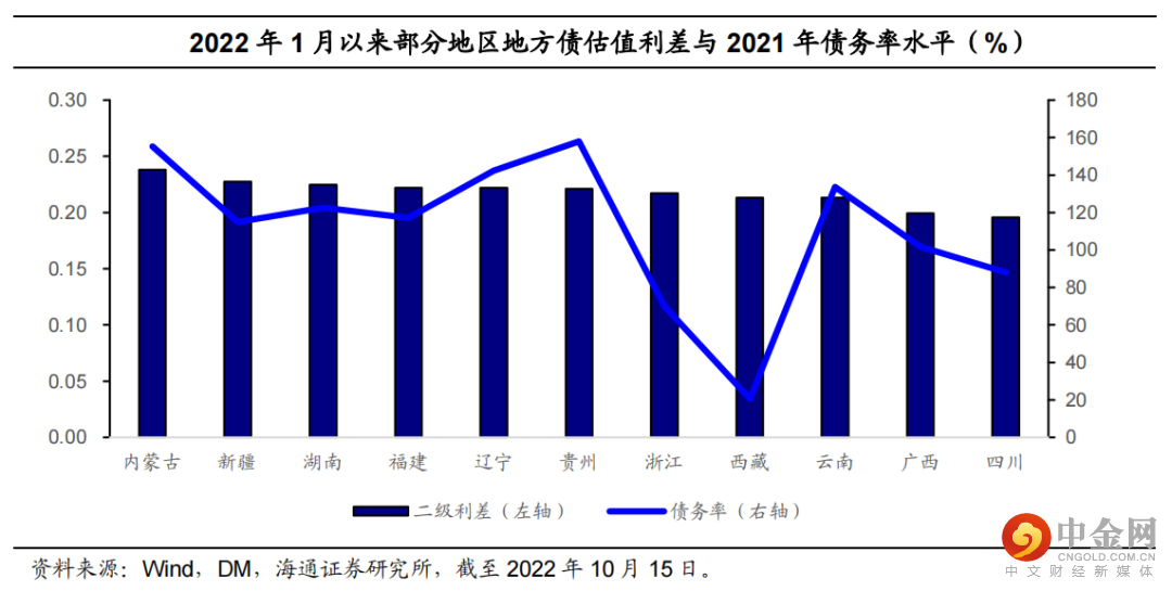 22年1月以来发行地方债的省市(自治区)中,内蒙古、青海、新疆、辽宁和西藏的发行利差均超过25BP,为第一梯队。利差中枢目前在16.0BP左右,发行利差最低的地区为上海(+9.8BP),而发行利差最高的地区为西藏(+25.1BP)和新疆(+24.9BP),其次是内蒙古(+23.1BP)、辽宁(+22.6BP)和青海(+22.0BP);10月上半月平均发行利差为+13.7BP,与9月底(+13.6BP)相比基本持平。