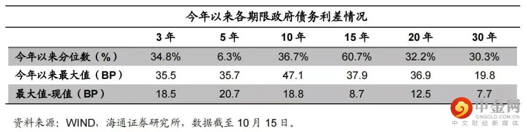 10 月以来,不同期限地方债利差均走扩,10 年期和 15 年期地方债利差走扩幅度较大。截至 10 月 15 日,地方债平均二级利差为 18.8BP。从地方债分期限平均利差来看,短久期和长久期利差水平较低。目前 10 年及 15 年地方债利差最高,分别为 28.2BP 和 29.1BP;30 年及 5 年的地方债利差最低,分别为 12.1BP 和 15.0BP;整体呈现两端低,中间高的格局。分位数水平来看,15 年期地方债利差位于今年以来 60.7%分位数水平,距离年内高点差 8.7BP;10 年期地方债利差分位数水平从 9 月中旬的 4.2%上升至目前的 36.7%,建议逐步关注调整后机会。