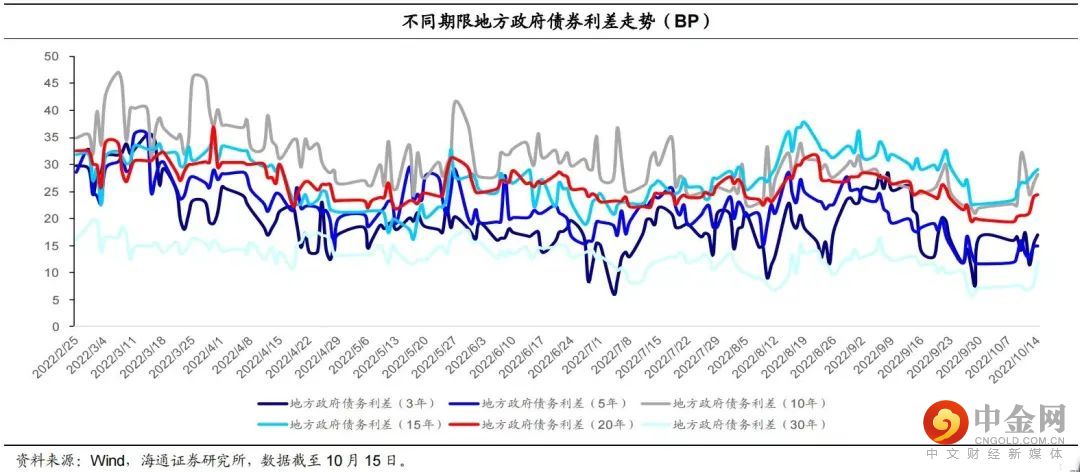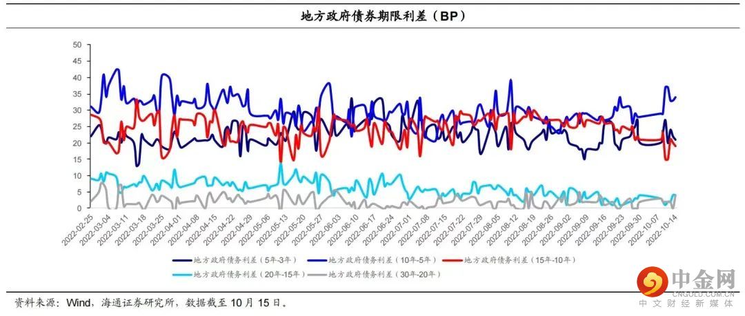 地方债整体二级估值利差走扩。各省市地方债平均估值利差(估值利差=地方债中债估值收益率-同期限中债国债收益率,平均利差以发行规模为权重)方面,我们选取今年 1 月以来估值利差前 11 的地区,可以发现,不排除样本量较少导致的误差,估值利差较高的地区集中于债务率较高的区域。2021 年全国平均地方债务率为 121.24%,在估值利差排名前 11 的地区中,有 5 个地区的 2021 年债务率高于平均水平。内蒙古和新疆的利差水平最高,截至 10 月 15 日,利差分别为 23.8BP 和 22.7BP。浙江虽然债务率较低,但拥有较高利差,主要和存量地方债期限分布有关。截至 10 月 15 日,地方债整体估值利差中枢在 18.8BP 左右,与 9 月 30 日的二级利差(17.6BP)相比有所走扩。