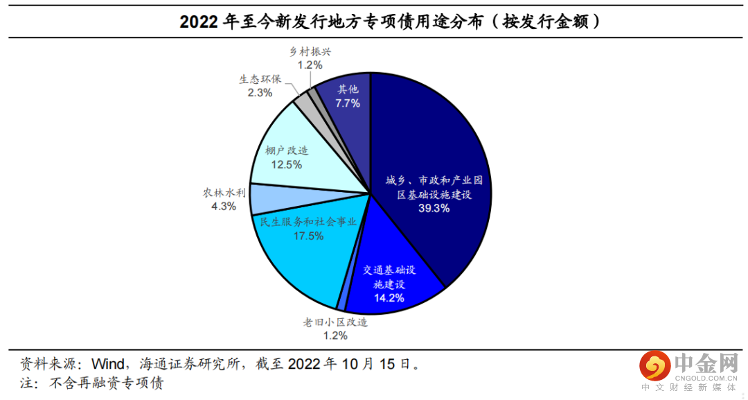 新增专项债方面,10 月上半月新增发行 15 支专项债,分别为重庆、广东、广西发行,均用于支持城市基础设施。截至 10 月 15 日,2022 年全国已发行地方专项债 1230 只,规模达 3.59 万亿元。从用途来看,用于城乡、市政和产业园区基建的专项债占比最大,达 39.3%;民生服务与社会事业为第二大用途,占比 17.5%,其次为交通基础设施建设和棚户改造,占比分别为 14.2%和 12.5%,其余部分投向农林水利、乡村振兴、老旧小区改造等领域。10 月上半月新增重庆市、广东、广西省用于支持城市基础建设的专项债券 15 支,规模为 439.0 亿元。