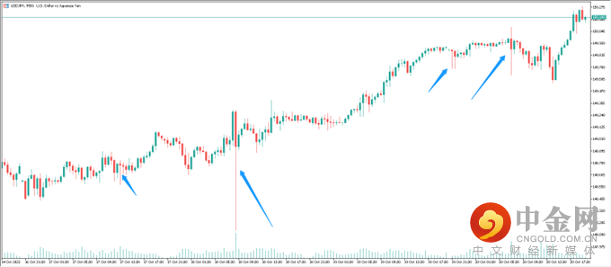 日元方面,美元兑日元(USDJPY)在凌晨冲破150大关,成为自1990年以来最高水平。虽然交易者未能等到日本央行发出的干预声明,但是从K线图上其实可以看到一些蛛丝马迹——多根阴烛下方出现巨大下影线,并且多有交易量支撑,价格也出现迅速下跌。