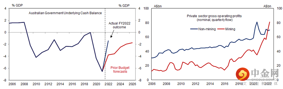 从中期来看,与2020年至2021年相比,赤字规模的持续减少可能会对澳大利亚未来几年的GDP增长带来不利影响。虽然政府可能会寻求以有针对性的方式缓解生活成本压力,但在高通胀环境上,这种对增长的不利影响是对通胀施加下行压力的必要条件。