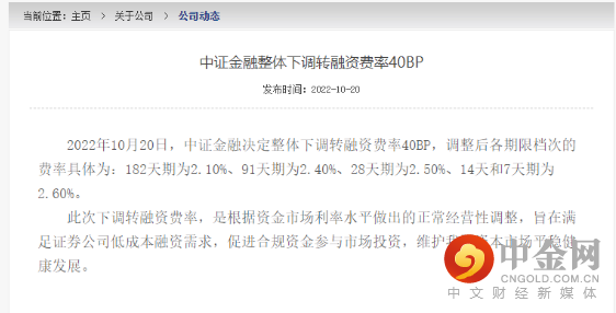 20日晚间,中国证券金融股份有限公司宣布,2022年10月20日,中证金融决定整体下调转融资费率40BP,调整后各期限档次的费率具体为:182天期为2.10%、91天期为2.40%、28天期为2.50%、14天和7天期为2.60%。