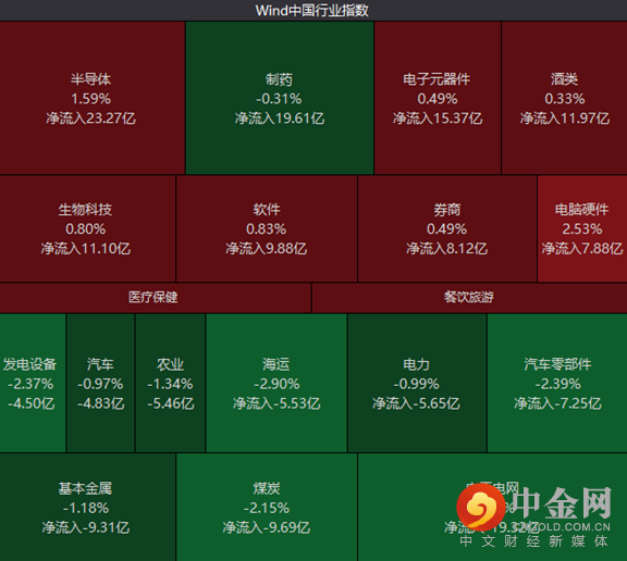 行业板块方面,半导体、制药、电子元器件、酒类等内容资金净流入排名靠前,电工电网、煤炭、基本金属等内容资金净流出。