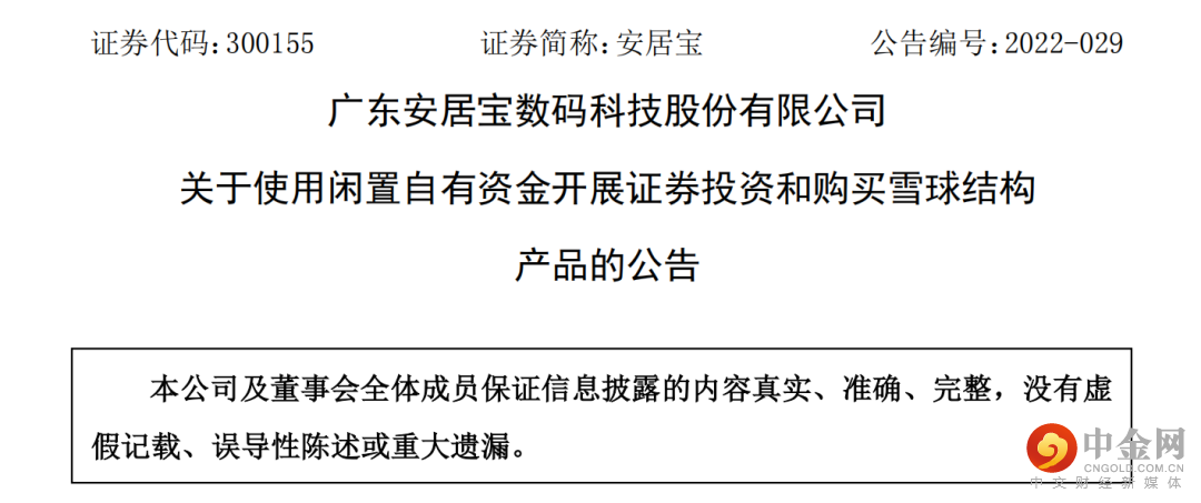 2022年10月14日晚间,上市公司广东安居宝数码科技股份有限公司(以下简称安居宝,代码300155)公告称:由于行业不景气,为提高公司存量资金的使用效率和效益,在保障日常生产经营资金需求,不影响公司正常经营的情况下,拟使用合计不超过2亿元闲置自有资金开展证券投资和购买雪球结构产品,为公司及股东创造更大的收益。其中证券投资额度为不超过 5000万元,购买雪球结构产品额度为不超过15000万元。