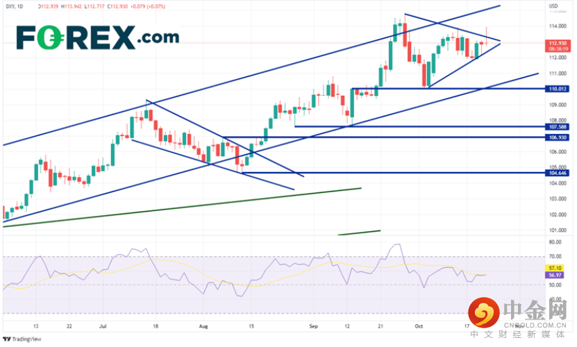 美元指数(DXY)和其他相对货币以及国债收益率走势快速反转。美元指数自高值113.94上升101点子,随后日内回落至112.94附近。值得注意的是,美元指数指数在上述消息传出后,突破三角旗形态。如果今日保持倒锤形态,则可能是假突破,价格或会测试周三形成的低点111.91。