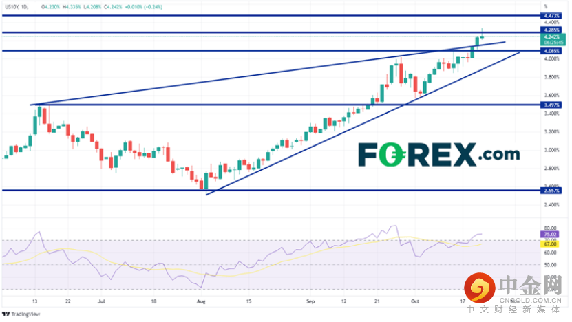 美债收益率走势相似。如果美联储开始放慢加息步伐,美债收益率将放缓走势。此前10年期美债收益率按上升楔形增长,不过预期收益率将跌破这一形态。周四收益率突破上轨是否会是一次假突破?《华尔街日报》发文后,10年期美债收益率走势变动与美元指数指数相似,在冲上新高后快速反转。如果日内保持倒锤形态,国债收益率将回归楔形,测试上升楔形下轨,逼近3.85%。同时值得注意的是,RSI表现与国债收益率相反,表明将出现盘整。