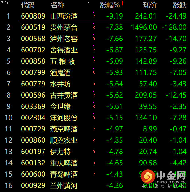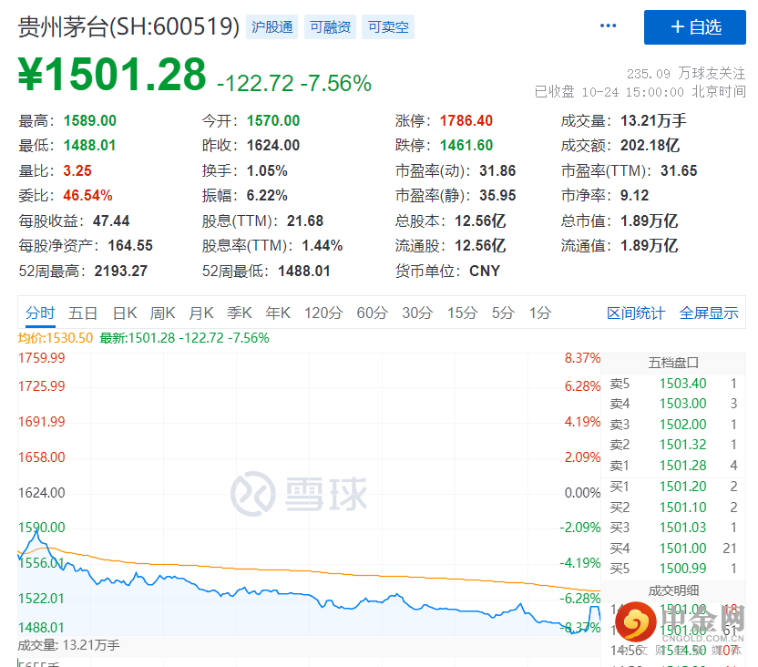 贵州茅台一度跌破1500元大关,一股茅台一瓶酒。白酒股盘中大幅下挫。