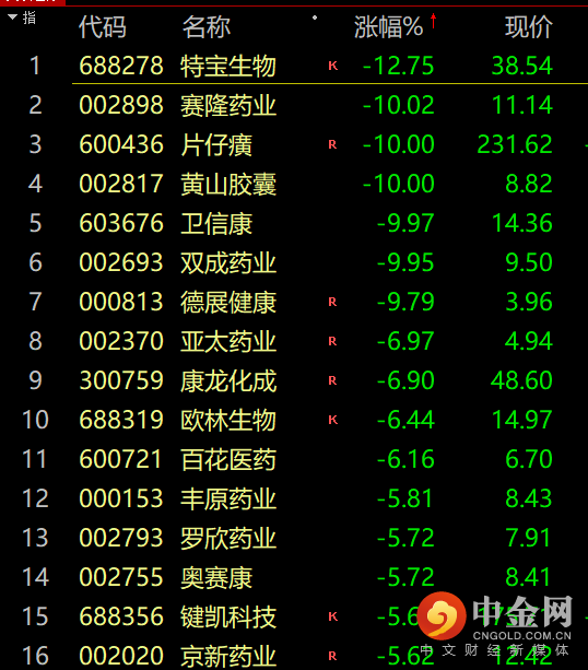 医药股持续走弱,片仔癀等多股跌停,片仔癀、赛隆药业、黄山胶囊、卫信康、双成药业、万方发展等跌停。