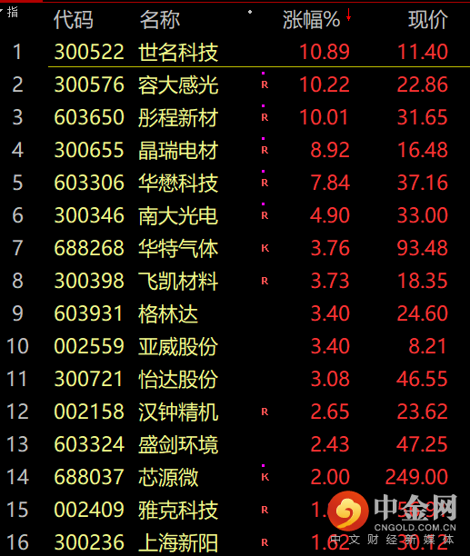 受国内光刻胶需求快速提升消息影响,光刻胶概念爆发,彤程新材涨停,容大感光涨超10%,南大光电、晶瑞电材、飞凯材料、强力新材等纷纷冲高。
