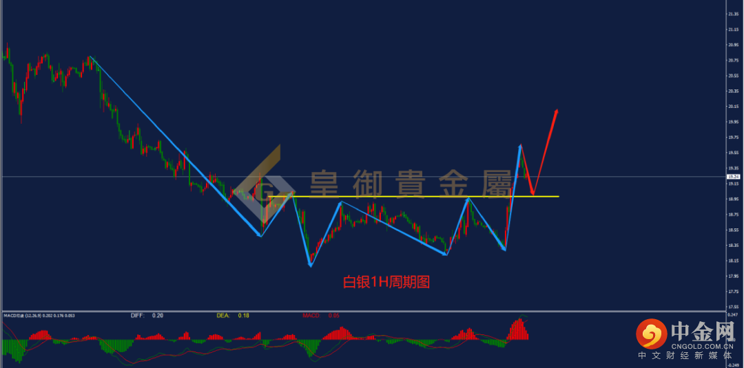 从下方白银1小时周期图看,白银自此前跌至下方支撑18.06附近后迎来调整,并构建震荡区间。上周五晚间,白银强势上行,向上突破区间顶部压力后延续上行。当前从指标上来看,MACD指标的多头动能呈现放量形态,且DIFF与DEA双线成功上穿0轴,预计白银后市大概率将迎来延续上涨,日内操作建议以低多为主,可等待行情向下回踩确认此前区间顶部支撑19.00附近后入场多单。