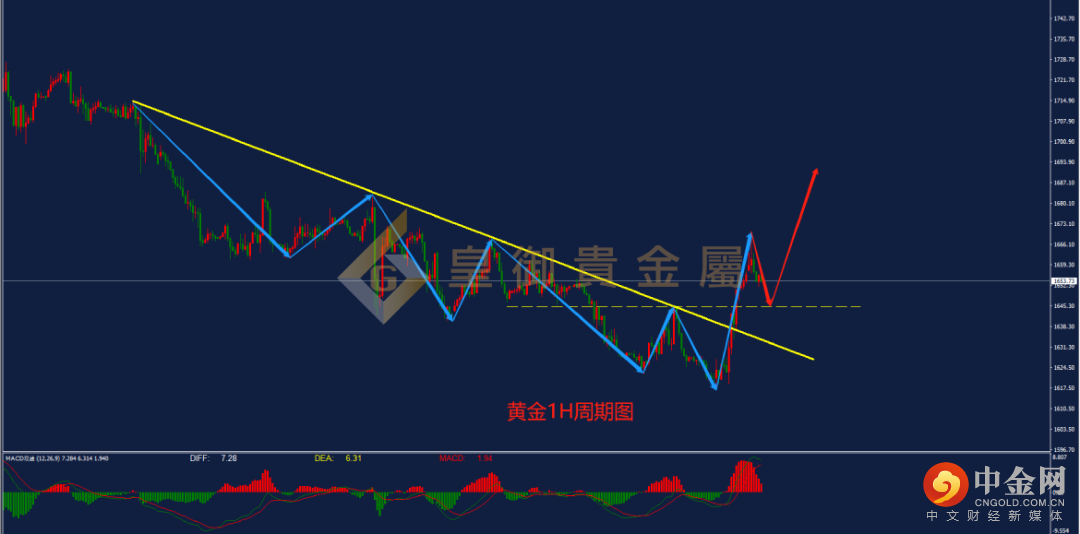 从黄金1小时周期图来看,黄金自此前延续下跌至1618一线支撑后,于上周五迎来上涨,向上强势突破此前构建的下跌趋势线,并成功企稳于趋势线上方,日内上涨达到近40美金的空间。从指标上来看,当前MACD指标的多头动能呈现放量形态,且DIFF与DEA双线成功上穿0轴,预计行情后市大概率将进行延续上涨。日内操作建议以逢低做多为主,可于下方关键支撑1645一线进行入场。