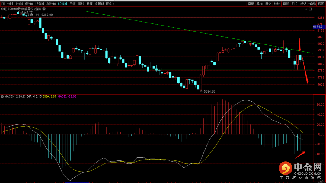 中证500短期在5800附近遇到支撑,但由于macd留下了长量柱但并未新低,后续大概率还会有再次试探5770附近的可能出现。观察日线底分何时出现,从周期看下一个变盘点大概率会出现在下周二。