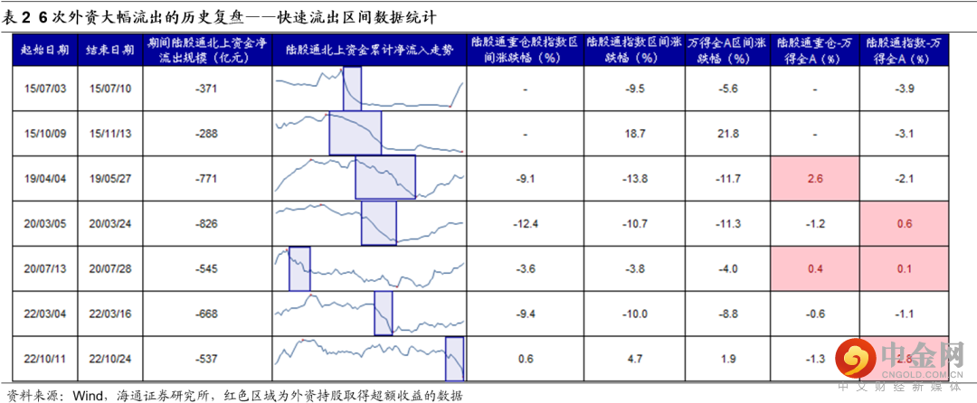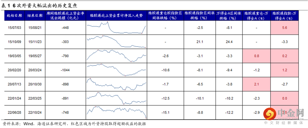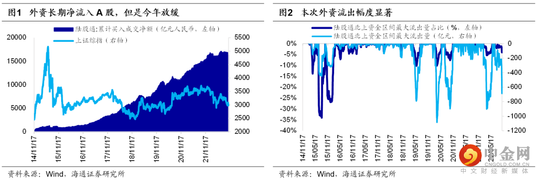 外资流出多为外因,持续时间多为月度级别。拉长时间看,外资总是净流入A股的,但部分时期会有些波折。我们以外资区间流出量绝对额或者流出量相对外资累计净流入量的百分比来寻找历史上外资大幅流出的区间,我们可以发现不算本次,14年以来外资大幅流出有6次,绝大多数时候催化剂都是外因,持续时间多为月度级别,详情见表1: