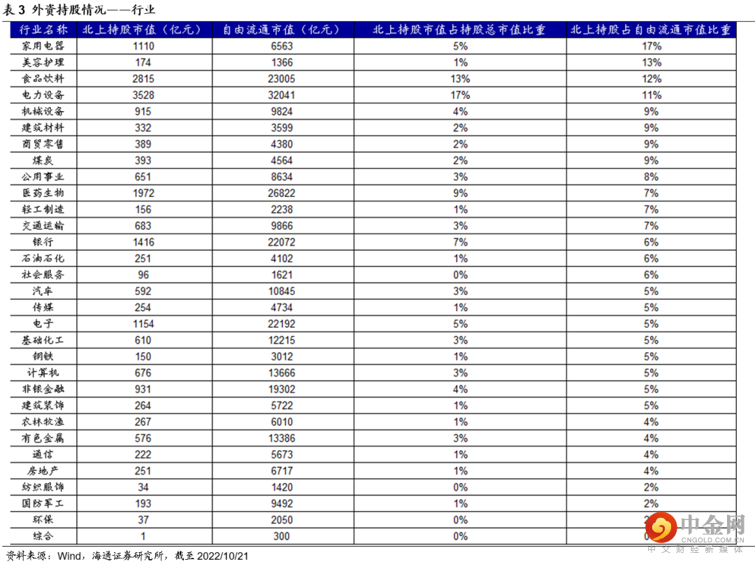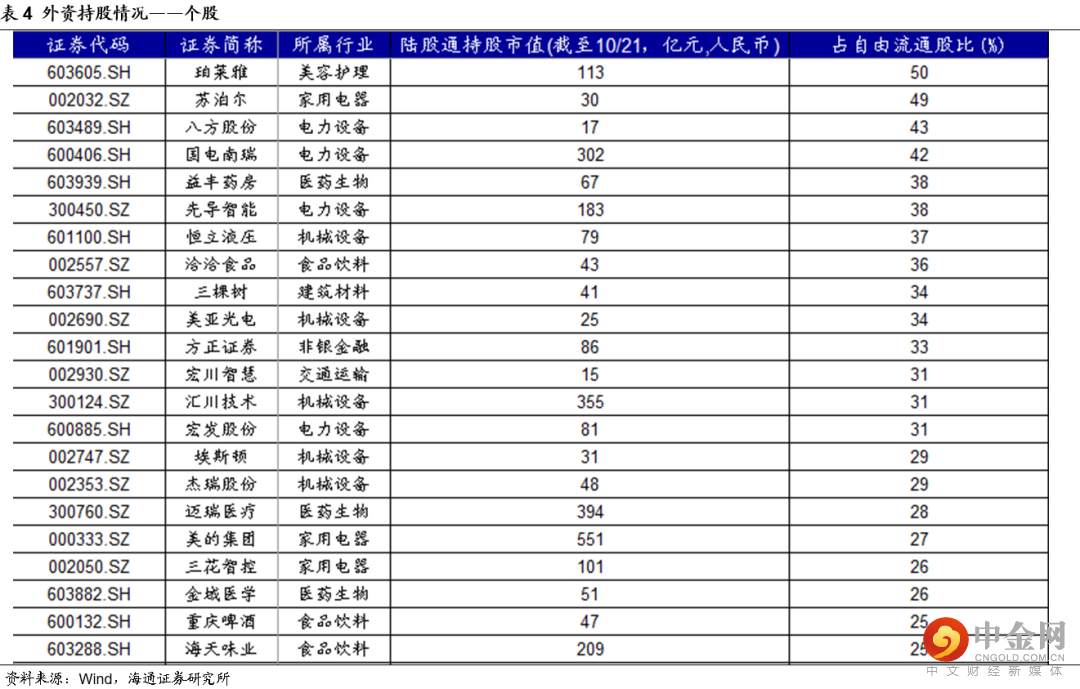 外资持股结构方面,大消费行业中外资占比最高,或受外资边际变化影响较大。以陆股通北上资金持有股本占自由流通股本比重来衡量,家电、医美、食品饮料等行业中外资占比较高;珀莱雅、苏泊尔、八方股份等个股外资占比较高。详见表3和表4。