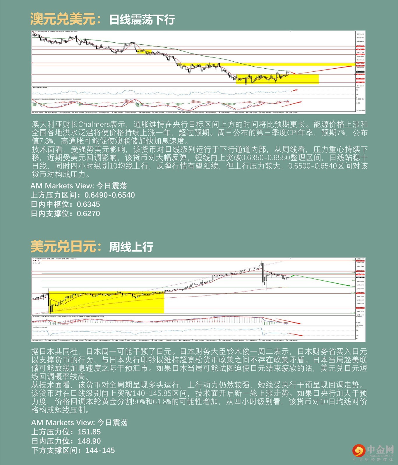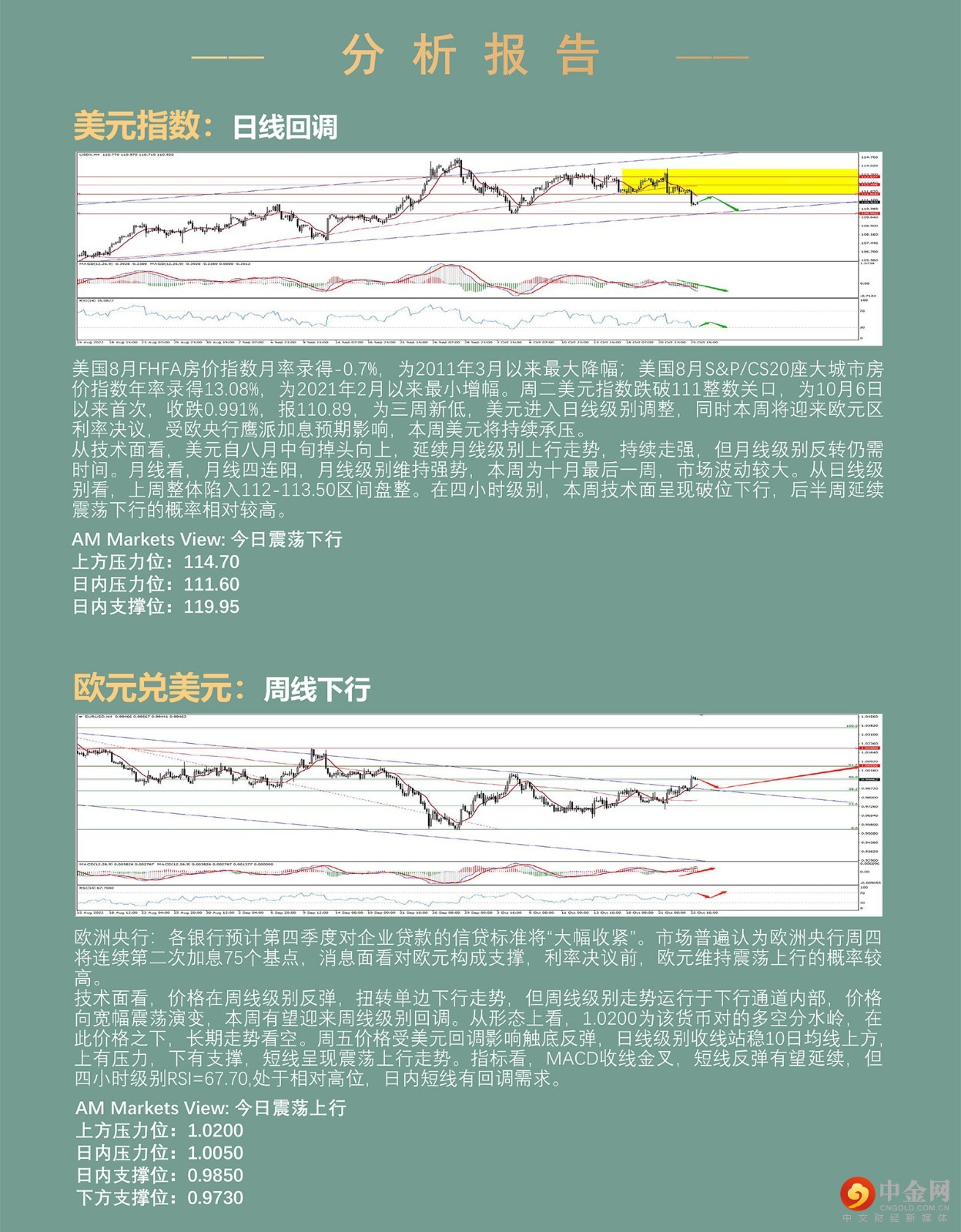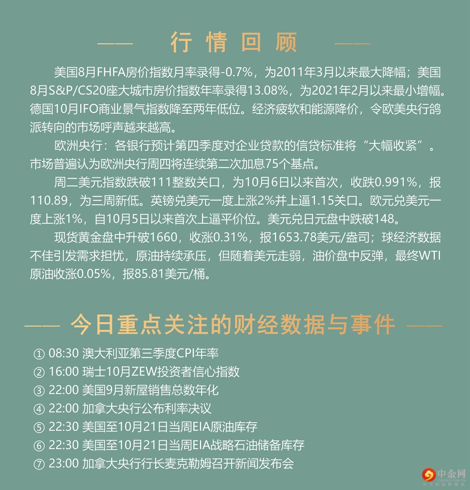 美国8月FHFA房价指数月率录得-0.7%,为2011年3月以来最大降幅;美国8月S&P/CS20座大城市房价指数年率录得13.08%,为2021年2月以来最小增幅。德国10月IFO商业景气指数降至两年低位。经济疲软和能源降价,令欧美央行鸽派转向的市场呼声越来越高。 欧洲央行:各银行预计第四季度对企业贷款的信贷标准将“大幅收紧”。市场普遍认为欧洲央行周四将连续第二次加息75个基点。 周二美元指数跌破111整数关口,为10月6日以来首次,收跌0.991%,报110.89,为三周新低。英镑兑美元一度上涨2%并上逼1.15关口。欧元兑美元一度上涨1%,自10月5日以来首次上逼平价位。美元兑日元盘中跌破148。 现货黄金盘中升破1660,收涨0.31%,报1653.78美元/盎司;球经济数据不佳引发需求担忧,原油持续承压,但随着美元走弱,油价盘中反弹,最终WTI原油收涨0.05%,报85.81美元/桶。