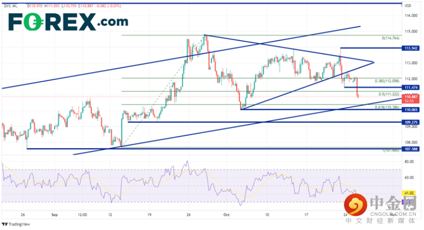 从4小时图来看,正如上文所述,美元指数正在测试200天移动平均线(见日线图),突破9月13日低点至9月28日高点的50%回档位,落在111.22。如果价格持续走低,长期通道下轨将与61.8%回档位将在110.39附近交汇,形成第一个支撑位区间,下一支撑位则在10月4日低点110.07。第三个支撑位则落在9月14日低点109.28。然而,如果美元指数坚挺并继续攀升,则第一个阻力位将在10月24日低点111.41形成。继续向上,指数可能分别向对称三角形两条轨线上的112.70和113.25波动,然后上探113.94(10月21日高点)。