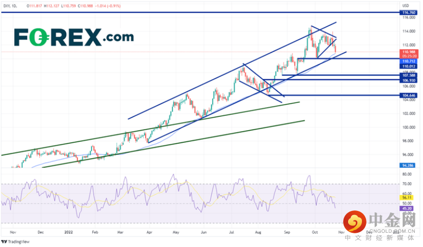 美元指数在四月初时仍不足100,之后进入急速上升通道。9月26日,指数假突破冲出通道,上探高点114.78,随后回撤落回通道内。自此,指数价格在通道中的对称三角形形态内盘整。然而在10月21日,日本央行疑干预外汇市场,抛售美元并买入日圆,而美元指数再度假突破冲出三角形态,随后遭抛压,最终收盘价位于三角形顶点下方。本周周一和周二,美元指数继续走低,目前在200天移动平均线110.71附近试探。