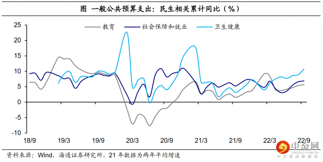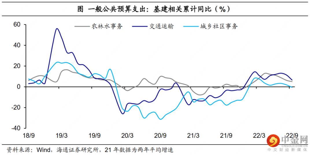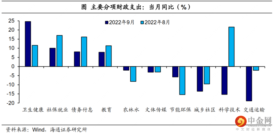 9月交通运输、城乡社区支出增速分别为-18.9%、-13.6%,相比8月降幅进一步扩大,而农林水支出增速为-2%,相比8月的-8.2%降幅有所收窄。我们认为,基建支出短期偏慢或与疫情反复对施工进度的扰动有关。接下来基建仍是稳增长的重要抓手。随着10月份专项债或迎来发行高峰,基建相关支出或有所改善。