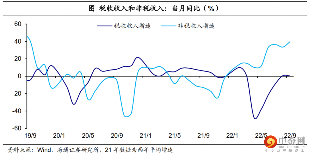 财政收入增速持续回升。2022年9月,全国一般公共预算收入同比增速8.4%,相比8月的5.6%继续回升。其中税收收入、非税收入增速分别为0.4%、39.7%,前者小幅回落,后者在高位运行基础上进一步回升。近两个月财政收入增速持续回升,一方面与经济缓慢修复有关;另一方面,更多受非税收入的拉动。考虑到税收增速回落,经济表现仍然偏弱。