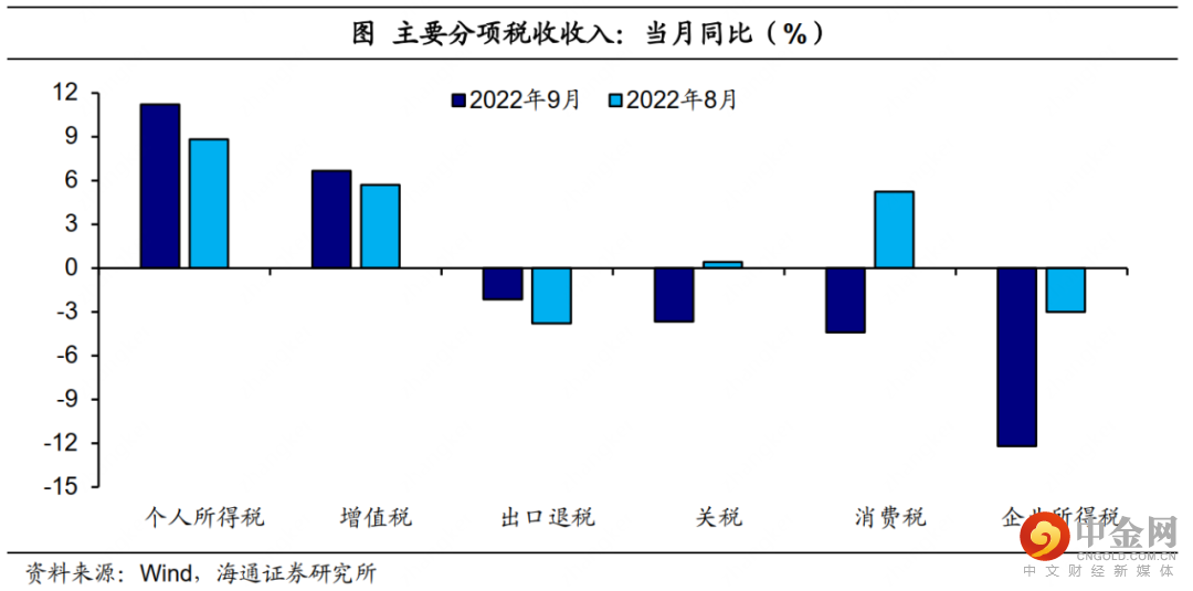 税收收入增速小幅回落。2022年9月,全国税收收入增速0.4%,相比8月的0.6%小幅回落。其中,增值税增速由8月的5.7%升至6.7%。个人所得税增速为11.2%,相比8月的8.8%小幅回升,仍然保持较高增长。相比之下,企业所得税增速为-12.2%,相比8月的-3%降幅进一步扩大。究其原因,一方面或与减税降费的落实有关。另一方面,经济需求偏弱,企业经营承压。9月消费税增速-4.4%,下半年以来首次落入负向区间,反映疫情反复下消费仍然是经济恢复的薄弱环节。