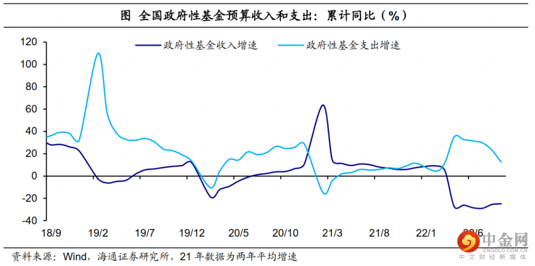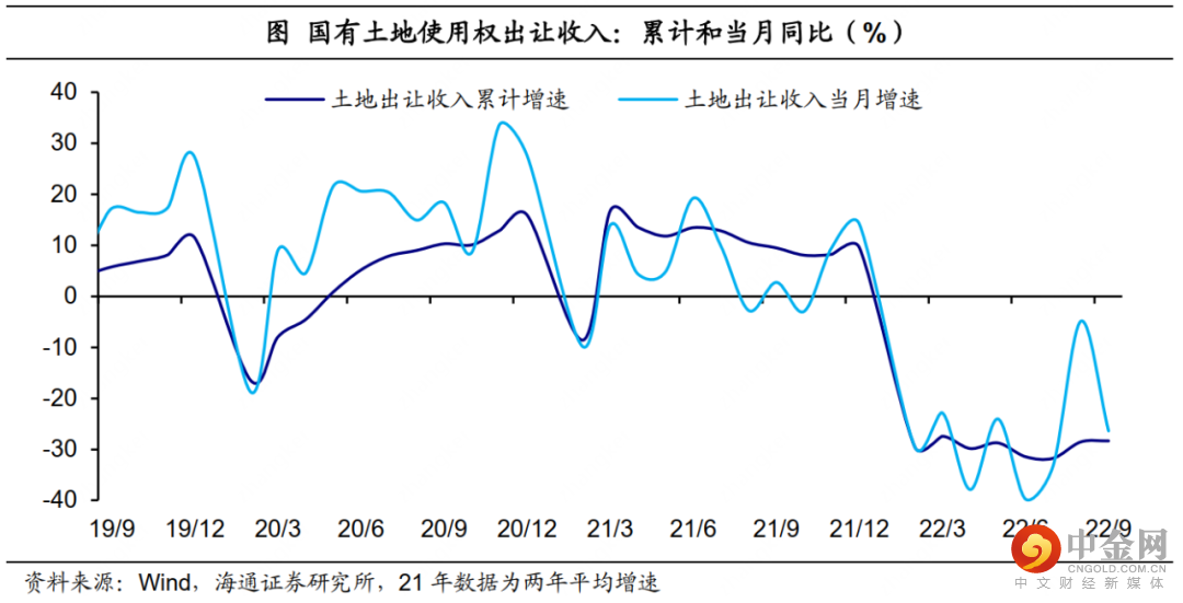 政府性基金收支降幅扩大。2022年9月,全国政府性基金预算收入同比下降19.2%,跌幅再度走扩。其中,国有土地使用权出让收入同比增速为-26.4%,相比8月的-4.9%降幅扩大。究其原因,2022年以来,随着房地产销售面积增速转负,房企拿地积极性转弱,使得土地市场遇冷,政府性基金收入也明显回落。
