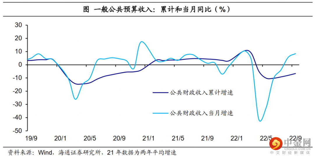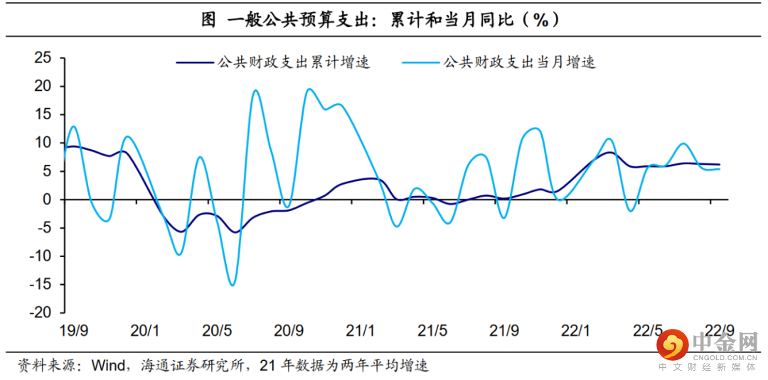 支出增速小幅回落。2022年9月,全国一般公共预算支出同比增速5.4%,相比8月的5.6%略有所下滑。目前经济表现仍然偏弱,支出端的发力受到一定制约,但是仍然保持了必要的支持力度,尤其是兜底保障基本民生。