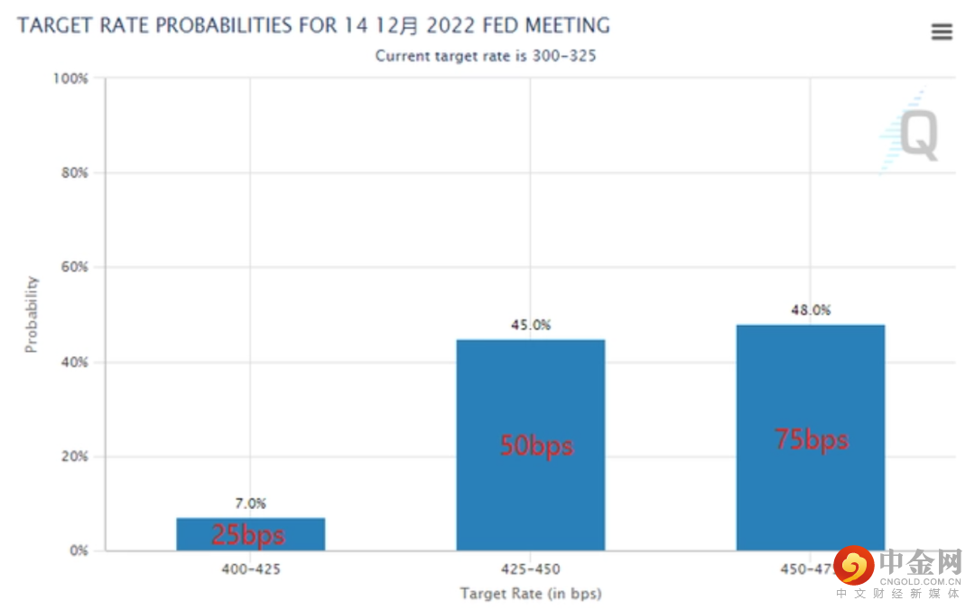 据芝商所“美联储观察”工具显示,截至发稿,联邦基金期货市场认为美联储在12月中旬的会议上有45%的概率加息50个基点,加息75个基点的可能性则高达48%,另外7%的概率为仅加息25个基点。从概率可以看出,交易员目前对美联储今年最后一次会议的加息幅度预期存在非常明显的分歧。
