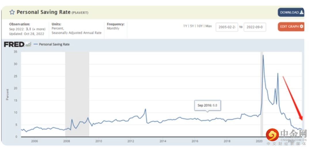 美国商务部上周发布的数据显示,第三季度,美国消费者支出增速从上一季度的2%放缓至1.4%,创近两年新低,消费购买力继续以3%的速度回落。与此同时,据美国经济分析局(BEA)的数据,9月份的个人储蓄率下降至3.1%,创近14年来的新低。