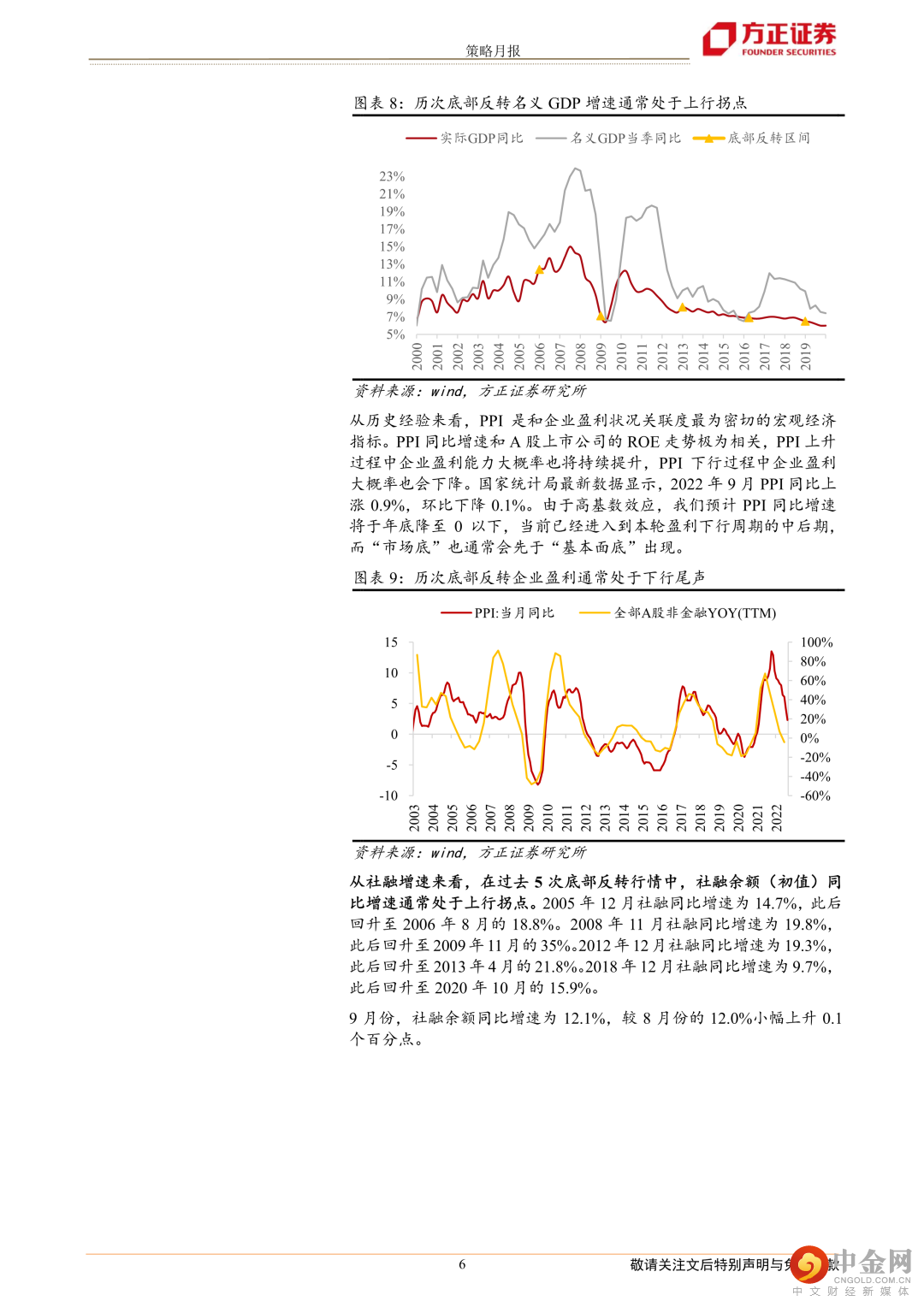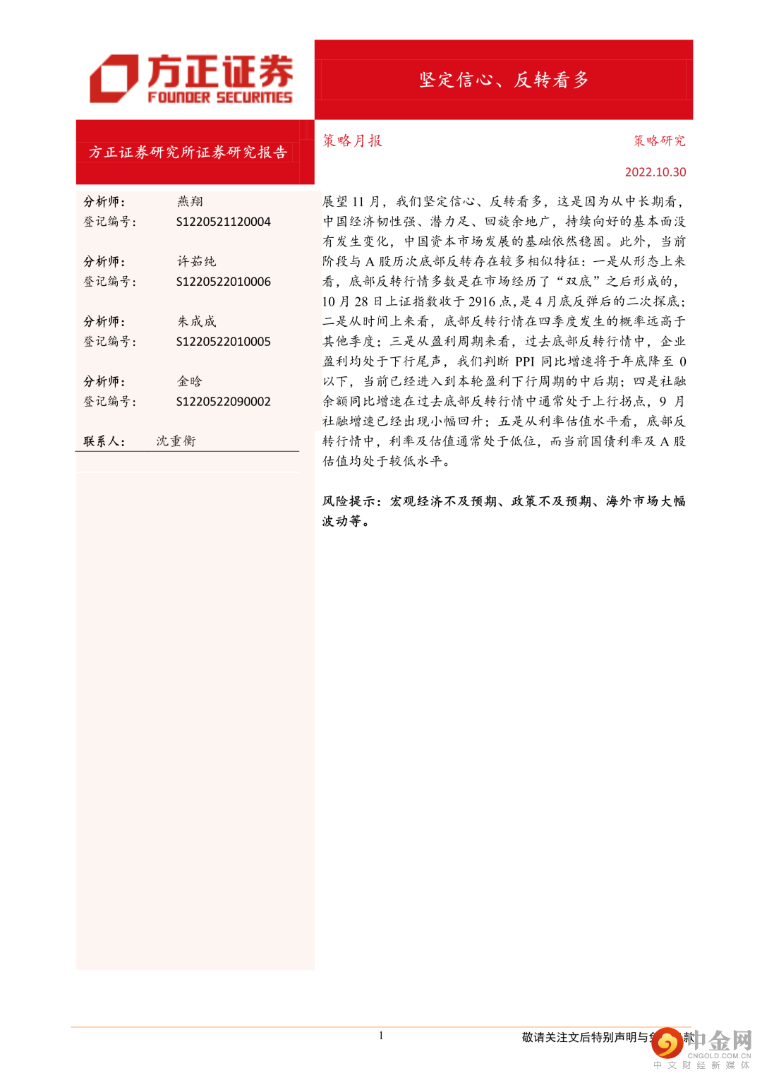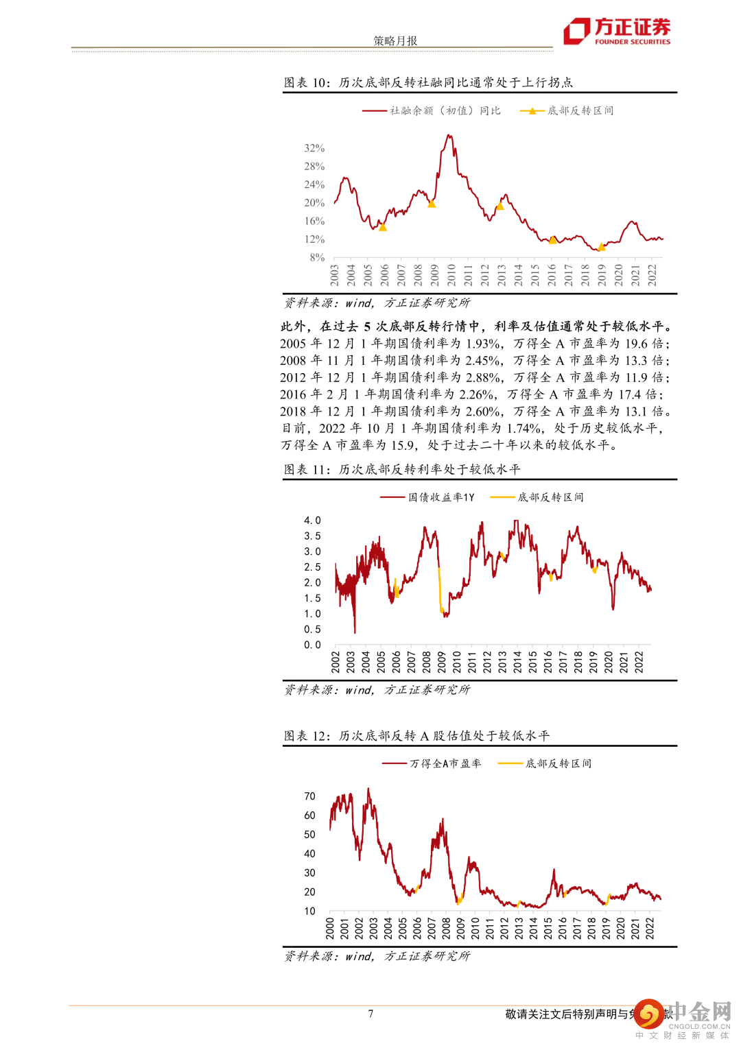 展望11月,我们坚定信心、反转看多,这是因为从中长期看,中国经济韧性强、潜力足、回旋余地广,持续向好的基本面没有发生变化,中国资本市场发展的基础依然稳固。此外,当前阶段与A股历次底部反转存在较多相似特征:一是从形态上来看,底部反转行情多数是在市场经历了“双底”之后形成的,10月28日上证指数收于2916点,是4月底反弹后的二次探底;二是从时间上来看,底部反转行情在四季度发生的概率远高于其他季度;三是从盈利周期来看,过去底部反转行情中,企业盈利均处于下行尾声,我们判断PPI同比增速将于年底降至0以下,当前已经进入到本轮盈利下行周期的中后期;四是社融余额同比增速在过去底部反转行情中通常处于上行拐点,9月社融增速已经出现小幅回升;五是从利率估值水平看,底部反转行情中,利率及估值通常处于低位,而当前国债利率及A股估值均处于较低水平。