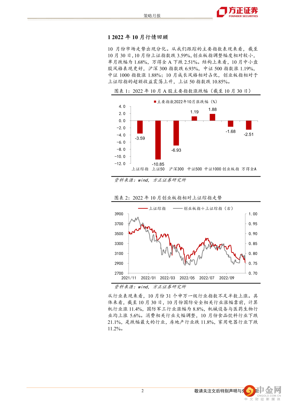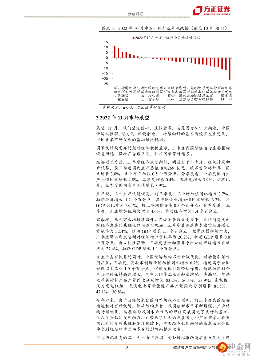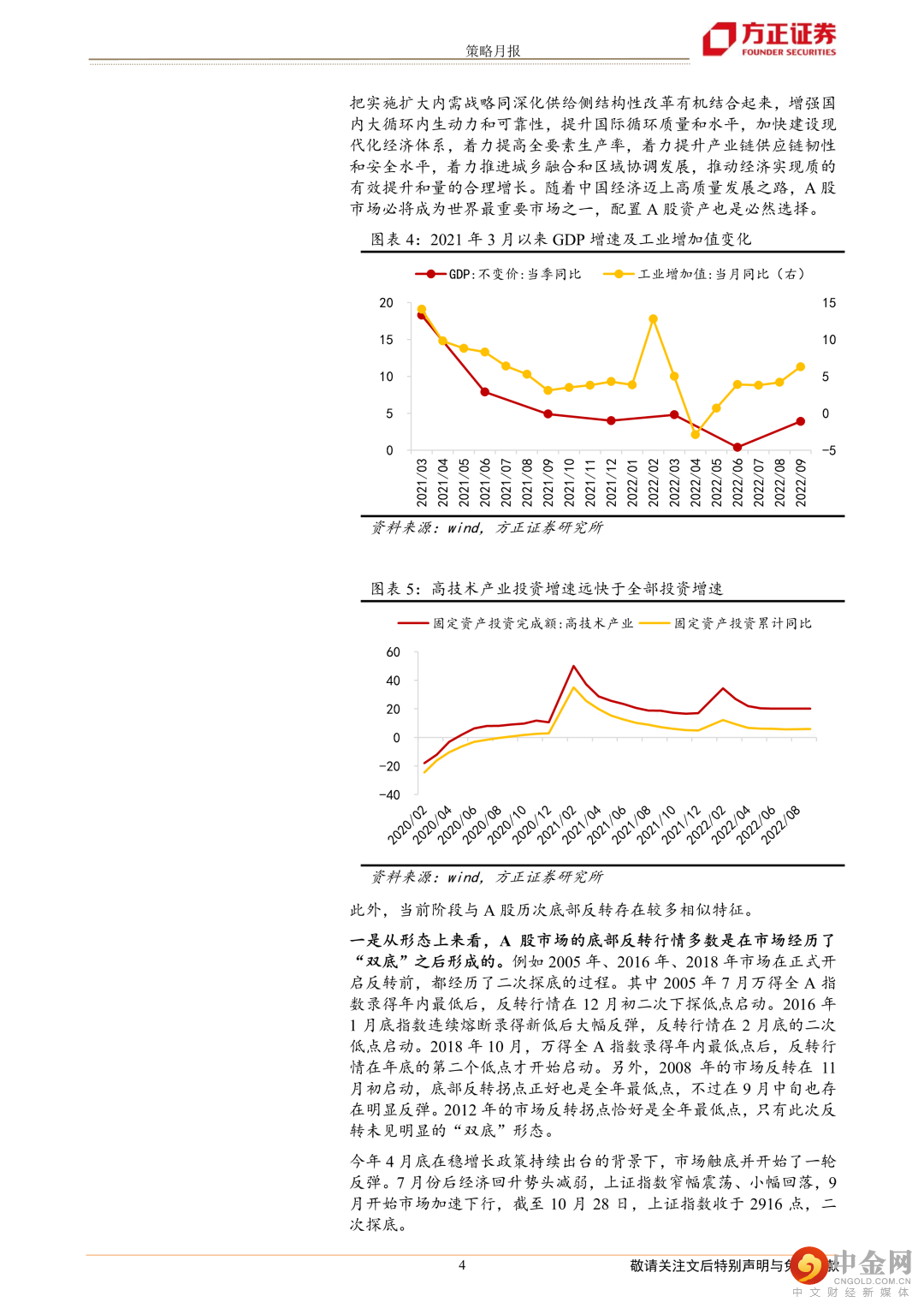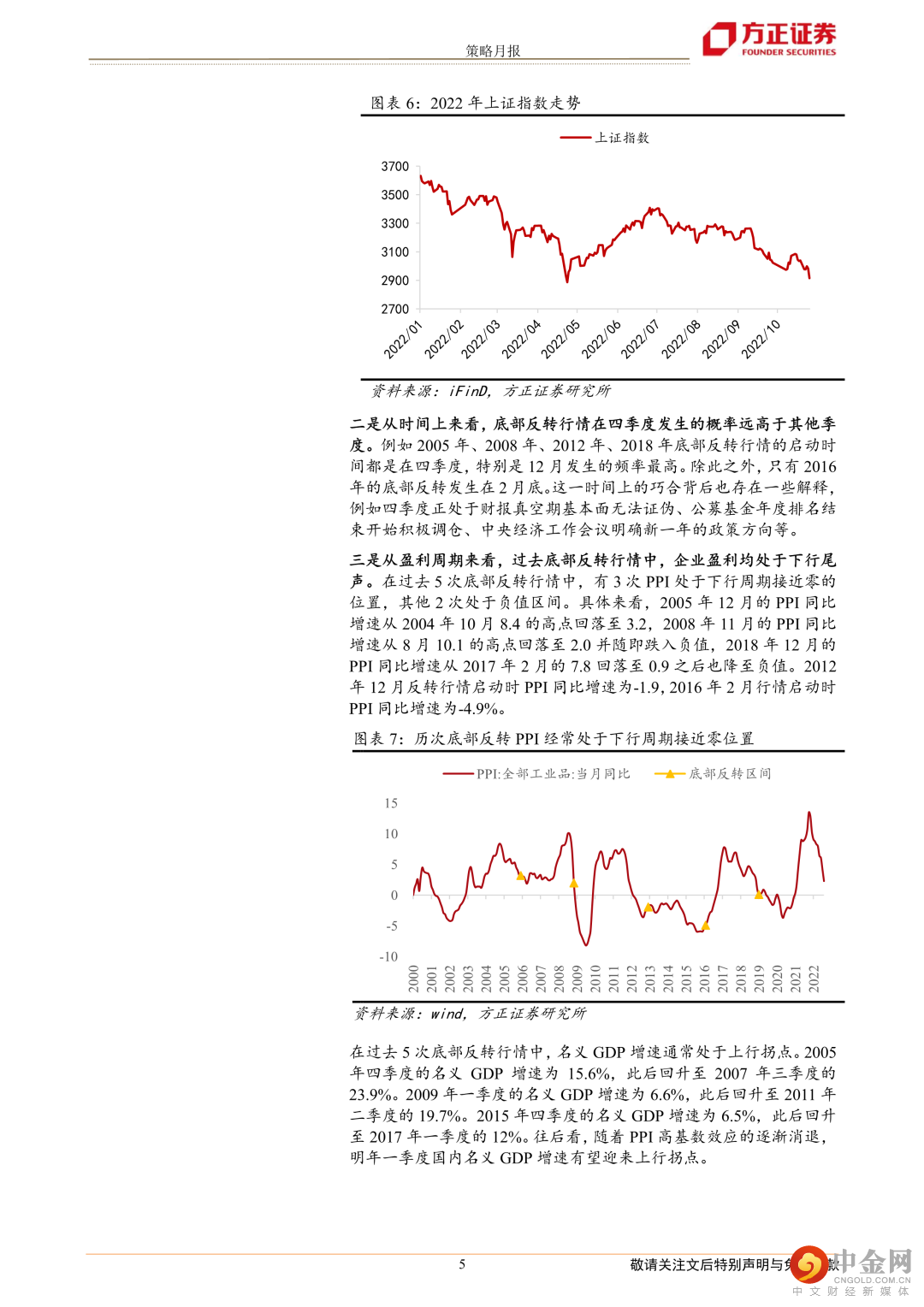 展望11月,我们坚定信心、反转看多,这是因为从中长期看,中国经济韧性强、潜力足、回旋余地广,持续向好的基本面没有发生变化,中国资本市场发展的基础依然稳固。此外,当前阶段与A股历次底部反转存在较多相似特征:一是从形态上来看,底部反转行情多数是在市场经历了“双底”之后形成的,10月28日上证指数收于2916点,是4月底反弹后的二次探底;二是从时间上来看,底部反转行情在四季度发生的概率远高于其他季度;三是从盈利周期来看,过去底部反转行情中,企业盈利均处于下行尾声,我们判断PPI同比增速将于年底降至0以下,当前已经进入到本轮盈利下行周期的中后期;四是社融余额同比增速在过去底部反转行情中通常处于上行拐点,9月社融增速已经出现小幅回升;五是从利率估值水平看,底部反转行情中,利率及估值通常处于低位,而当前国债利率及A股估值均处于较低水平。