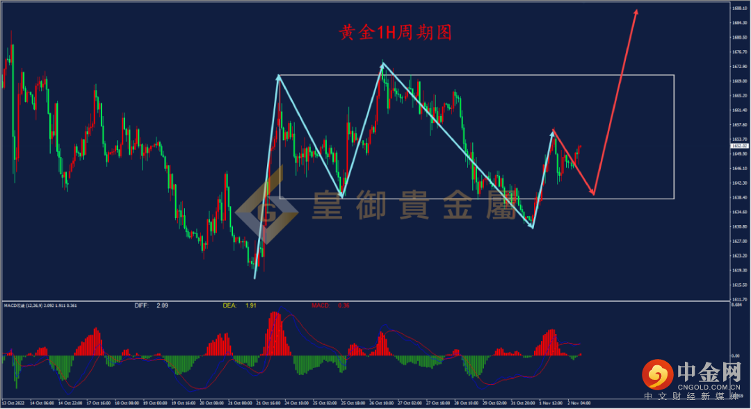 从黄金1H周期走势结构看,黄金自1617.0附近上涨,在涨至1670.0附近后受阻回落,走出A、B、C三波回调走势,昨日在跌至1630.0附近后上涨,预示调整行情或已结束,后市大概率延续上涨。结合1H周期MACD指标来看, DIFF线与DEA线处于零轴上方走势偏多,但红色能量柱较小,上行动能较弱,日内操作可等待下方1638.0附近尝试多单。