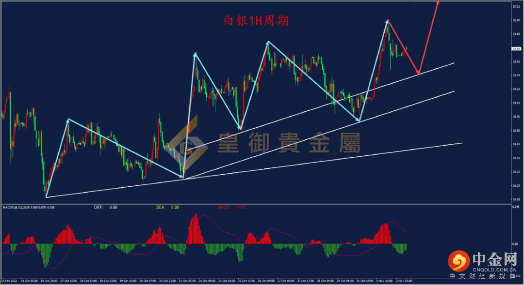 白银1小时周期图可以看出,白银自18.07附近上涨,高点逐渐抬高,低点也逐渐抬高,多头走势明显。按照白银前期走势规律,今日有回踩下方19.35附近可能。结合1H周期MACD指标来看,DIFF线与DEA线处于零轴上方走势偏多,但动能柱仍为绿色,表明上行动能不足,日内操作可等待回踩下方支撑19.35附近尝试多单。