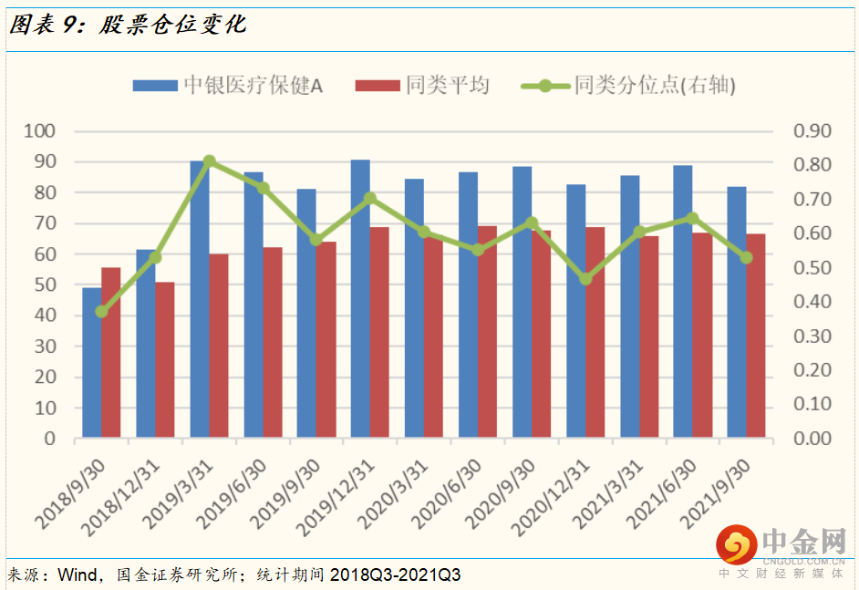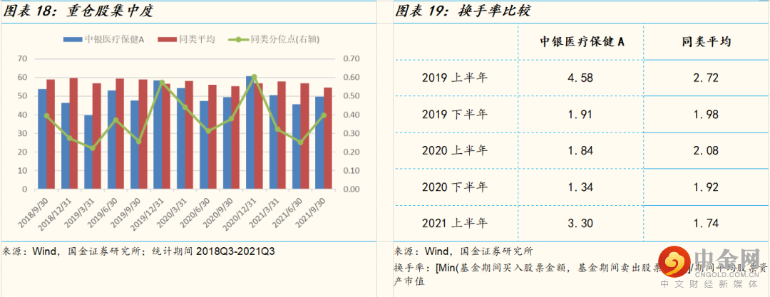 资产配置方面,除去前两个季度基金建仓因素,基金经理刘潇任职期间中银医疗保健A基金的股票仓位基本维持在80%至90%之间,同期(2019Q1-2021Q3)灵活配置型基金平均股票仓位为66.01%。基金保持相对中高仓位运作,且较少做仓位择时。