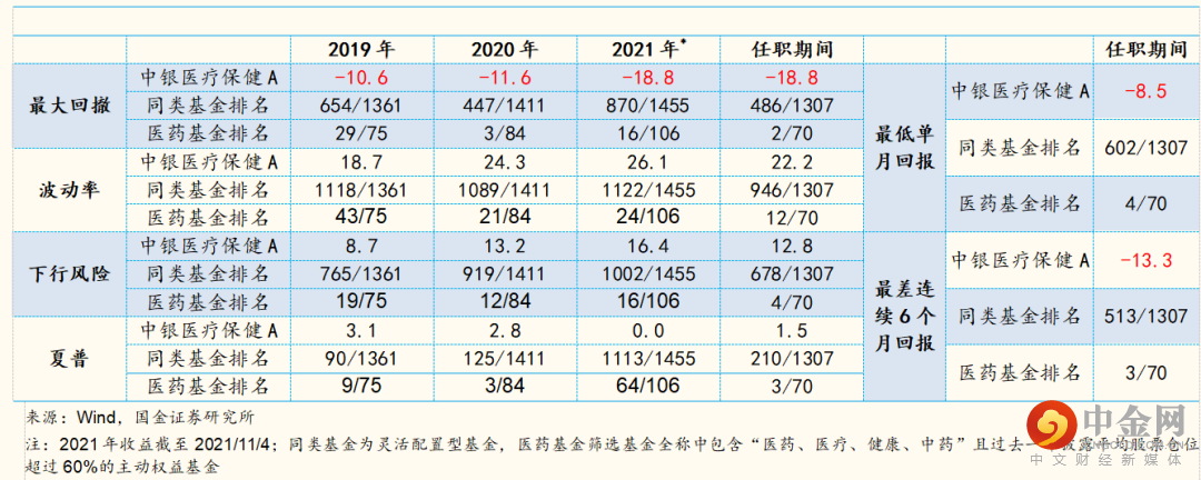 分年度来看,中银医疗保健A基金在刘潇管理的各个年度区间内收益表现均较为亮眼,2019~2020年牛市环境中基金相比同类灵活配置型基金以及医药主题基金均能跑出明显超额收益,在2021年行业Beta弱化的环境中回报也能够跻身医药主题基金的前50%,任职期间(2018/6/13-2021/11/4)的累计收益在同类基金和医药基金的排名分别为81/1307、3/70。风险层面,任职以来基金最大回撤为-18.8%,夏普比率为1.5,在同类1307只灵活配置型基金中分别排名第486和第210位,在同期的70只医药主题基金中分别排名第2和第3位,对于风险的控制同样较为出色。