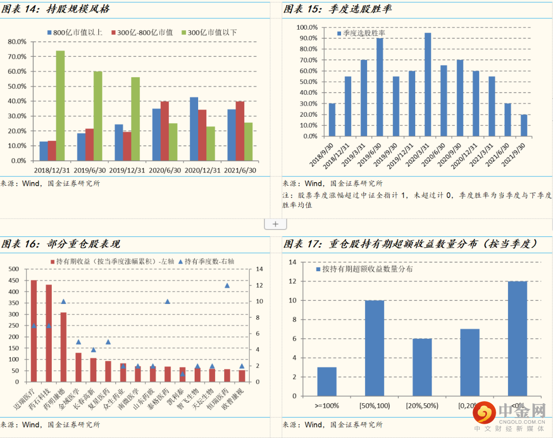 行业配置方面,持仓主要围绕医药的核心能力圈,子行业的配置相对均衡,收益贡献较为显著的有医疗研发外包、化学制剂、线下药店、体外诊断以及医疗耗材等子行业,收益来源较为广泛。持股规模风格方面,基金在中小盘股的配置比例整体高于大盘股,2020年以来伴随基金规模扩大,800亿市值以上的大盘股比例有所提升但基本不超过40%。个股权重方面,基金前十大重仓股集中度在刘潇任职期间维持在50%左右,个股配置相对分散。