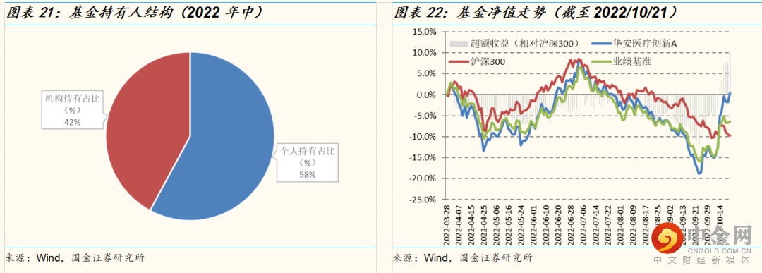 规模及持有人结构方面,截至2022年三季度末,华安医疗创新基金的合计规模达8.7亿元,相比2022年Q2下降2.6亿元,相比2022年Q1上升2.0亿元。从持有人结构上看,刘潇任职以来基金机构持有比例大幅提升,2022年中机构持有比例达42.1%。