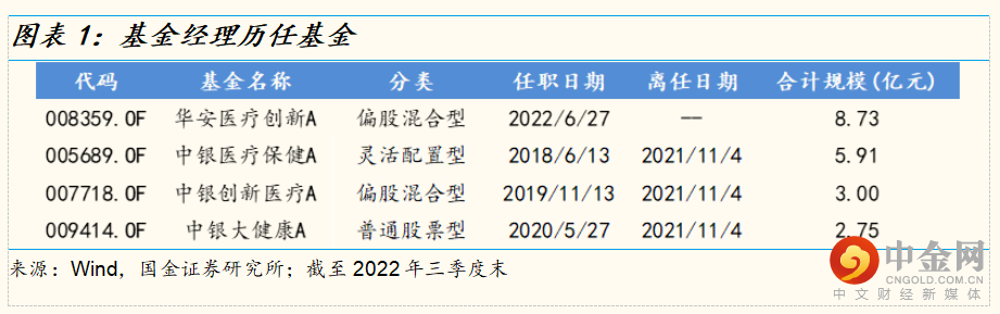 刘潇累计管理过4只基金,目前在管基金1只,为华安医疗创新A(008359.OF)。截至2022年三季度末,在管基金合计规模为8.7亿元。本文我们选取刘潇历史管理的基金中任职时间最长、最能体现基金经理投资风格和策略的中银医疗保健A基金为其代表产品做进一步分析,另外对目前在管基金的特征与代表产品进行简要对比。