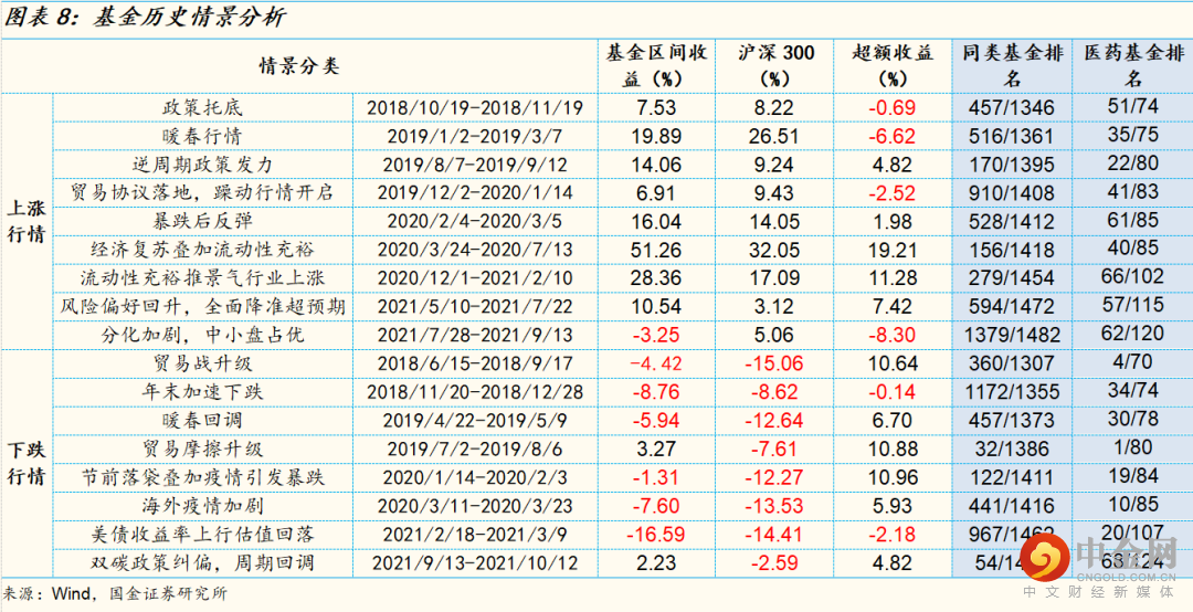 一方面由于刘潇在医药领域深耕多年、行业内公司覆盖度超过90%,各个子行业上都有持续跟踪,可以较好的把握任何一个子行业的投资机会,在医药占优的环境中展现高爆发的特性,例如2020/3/24-2020/7/13的区间内,经济复苏叠加流动性充裕,以CXO为代表的医药板块大幅上涨,中银医疗保健A基金涨幅达51.26%,相比沪深300超额收益接近20个点,同类排名前10%左右,涨幅同样超过医药主题基金平均水平;另一方面在组合构建上,持仓与同业相比相对均衡,抱团度较低、擅长独立思考,组合配置与其他医药基金存在一定差异化,子行业和个股均较为分散,基金收益来源广泛,因此在市场整体和医药行业回调的区间内仍能保持较好的相对收益。