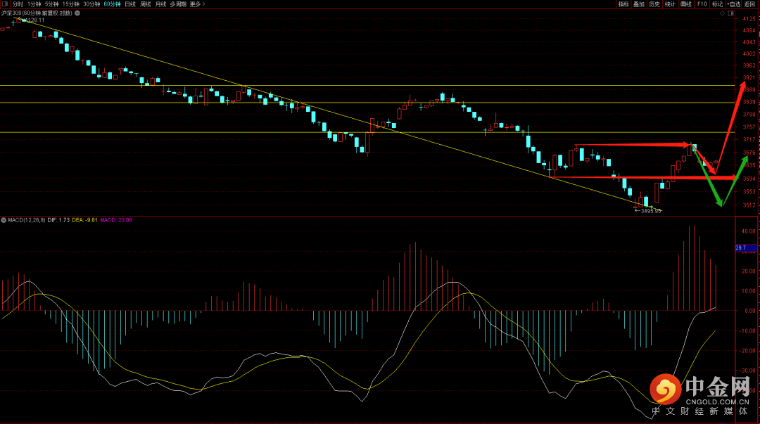 沪深300需要关注六十分钟结构是否能够形成头肩底形态,下方支撑在3594附近,一旦跌破就会有回补下方缺口的可能。届时调整周期将出现拉长。