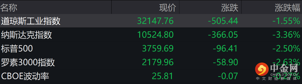 美联储主席鲍威尔在宣布加息后发表演讲时驳斥了美联储可能很快就会暂停加息步伐的想法,美股应声下跌。美国三大股指全线收跌,道指跌1.55%报32147.76点,标普500指数跌2.5%报3759.69点,纳指跌3.36%报10524.8点。