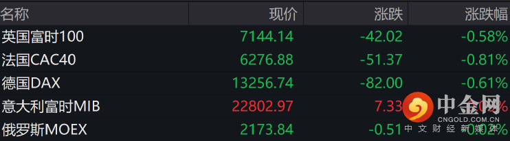 欧洲三大股指收盘同样全线下跌,德国DAX指数跌0.61%报13256.74点,法国CAC40指数跌0.81%报6276.88点,英国富时100指数跌0.58%报7144.14点。