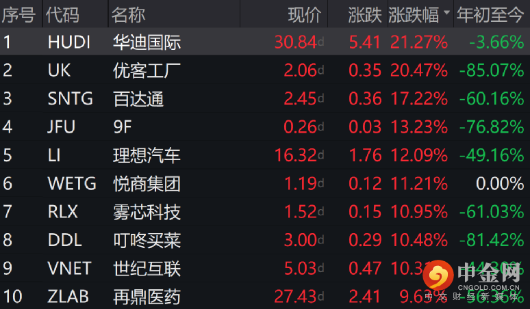 据Wind资讯,热门中概股涨跌不一,华迪国际涨21.27%,优客工厂涨20.47%,雾芯科技涨10.95%,叮咚买菜涨10.48%,世纪互联涨10.31%,再鼎医药涨9.63%,洪恩涨9.29%,百胜中国涨7.57%;跌幅方面,房多多跌17.76%,乐居跌16.67%,金太阳教育跌14.67%,金山云跌7.64%,中阳金融跌6.45%,尚乘数科跌5.33%。中概新能源汽车股多数上涨,蔚来汽车跌2.21%,小鹏汽车涨3.12%,理想汽车涨12.09%。