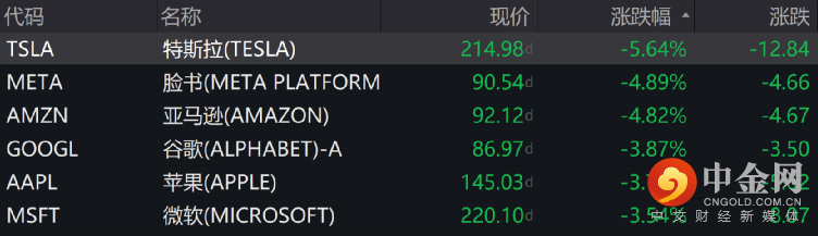 科技股表现疲软,特斯拉跌5.64%,脸书跌4.89%,亚马逊跌4.82%,谷歌跌3.87%,苹果跌3.73%,微软跌3.54%。