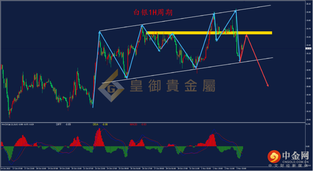 白银1小时周期走势结构看,白银自18.07附近上涨,随后震荡上行,白银昨日在涨至通道上轨压力位附近后快速下跌,再次来到下轨支撑附近。结合1H周期MACD指标来看,白银价格创出新高,但 DIFF线与DEA线并未创出新高,表明上行动能不足,走势有反转的可能。日内操作可参考上方交易密集19.60附近压力尝试布局空单。