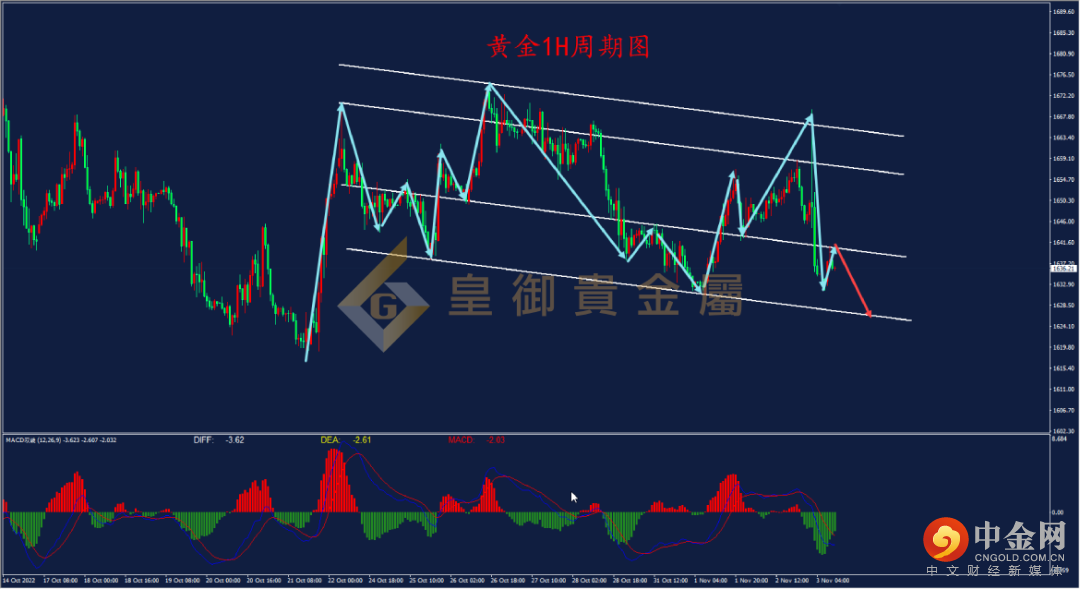 从黄金1H周期走势结构看,黄金自1617.0附近上涨,在涨至1674.0附近后受阻回落,走势形态上来看,每一波走势都围绕图中四条趋势线运行,按照此前走势规律,黄金今日有在下方第二条趋势线位置受阻。结合1H周期MACD指标来看, DIFF线与DEA线零轴下方死叉,表明走势偏弱,但绿色能量柱在逐渐缩小,短期下行动能不足,日内操作可等待上方1640.0附近尝试空单。