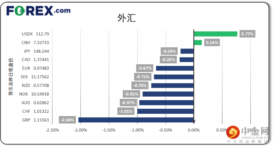英国央行加息75个基点,是32年以来最大幅度,但认为未来利率峰值将低于市场预取(和美联储截然相反)。央行预计经济将在未来两年持续衰退,通胀峰值将在年底前到达11%但明年将快速回落。英镑周三重挫2%。