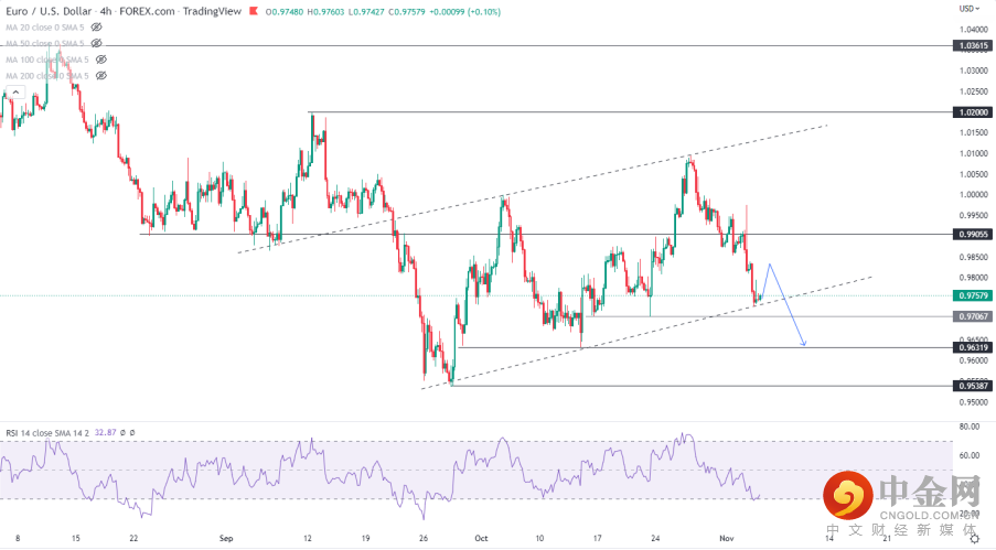 欧元在10月末尝试突破1.10未果之后又重新回到了长期下降通道当中,趋势性的空头没有改变。但4小时图上,RSI接近超卖且汇价接近下方支撑,空头可以留意短线反弹后更合适的机会。