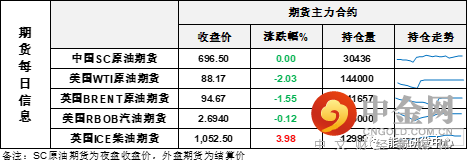 【1】WTI主力原油期货收跌1.83美元,跌幅2.03%,报88.17美元/桶;布伦特主力原油期货收跌1.49美元,跌幅1.55%,报94.67美元/桶;INE原油期货收跌0%,报696.5元。